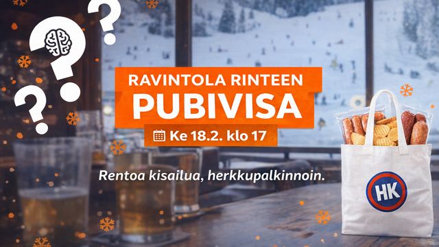 Kerää joukkue kasaan ja tule testaamaan tietosi Ravintola Rinteen hauskaan koko perheen pubivisaan! Luvassa rentoa tunnelmaa, naurua ja sopivasti kisahenkeä hiihtolomaviikkoon. Kolme parasta palkitaan – ja voittajajoukkue kruunataan...