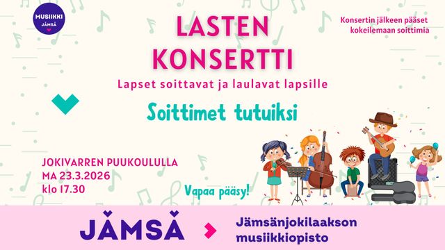 Jämsänjokilaakson musiikkiopisto järjestää Lasten konsertin Soittimet tutuiksi Jokivarren puukoululla ma 23.3. klo 17.30. Konsertissa lapset soittavat ja laulavat lapsille. Lyhyen konsertin jälkeen yleisöllä on mahdollisuus kokeilla...