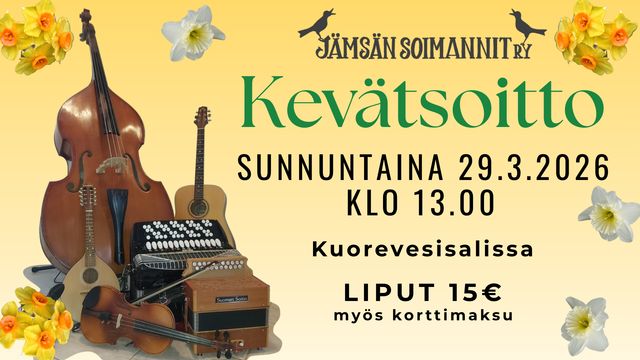 Perinteinen Jämsän Soimannien Kevätsoitto järjestetään palmusunnuntaina 29.3. klo 13.00 Kuorevesisalissa Hallissa.Konsertissa esiintyvät Soimannien omat ryhmät: Soimarit, mestaripelimanni Katja Lampinen, TrioLa (Laviranta - Lahti -...