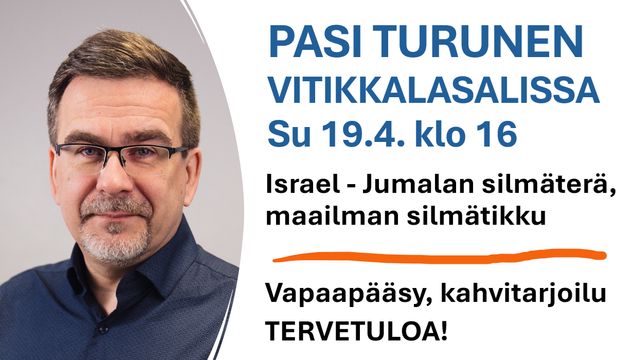 Patmos Lähetyssäätiön toiminnanjohtaja Pasi Turunen puhuu aiheesta "Israel - Jumalan silmäterä, maailman silmätikku". Tilaisuudessa on kahvitarjoitu. Vapaa pääsy. Tervetuloa!