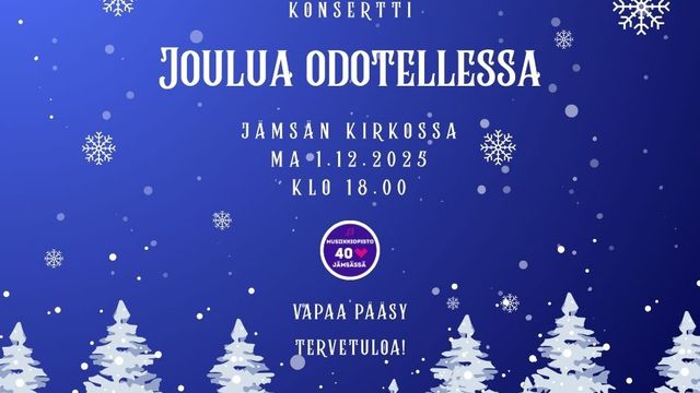 Jämsänjokilaakson musiikkiopiston perinteinen Joulua odotellessa -kirkkokonsertti siivittää jouluun. Konsertissa kuullaan sekä joulumusiikkia että syksyn satoa. Esiintymässä on opiston oppilaita, lapsia, nuoria ja aikuisia....