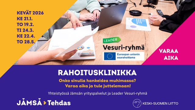 Onko sinulla hankeidea muhimassa, haluatko tavata meneillään olevan hankkeesi tiimoilta tai tarvitseeko yrityksesi tukea? Varaa aika ja tule juttelemaan!Rahoitusklinikalla tapaat Leader Vesuri-ryhmän ja Jämsän kaupungin...