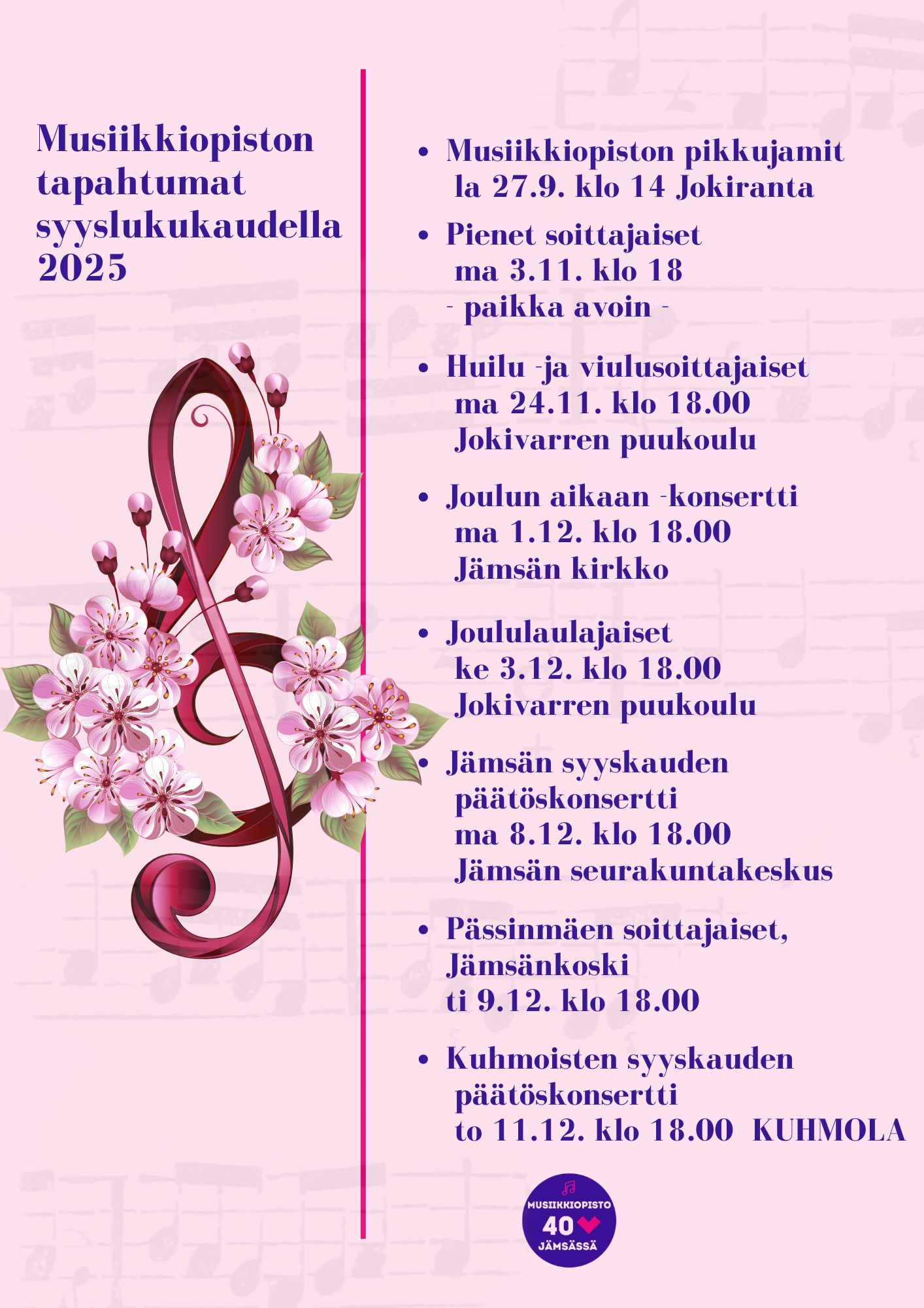 Ajankohtaista musiikkiopistolla Kuuntele Syyslukukauden 2025 tapahtumia Syksyn 2025 konsertit ja soittajaiset Musiikkia kaikkien iloksi, tervetuloa mukaan! Jaa sosiaalisessa mediassa