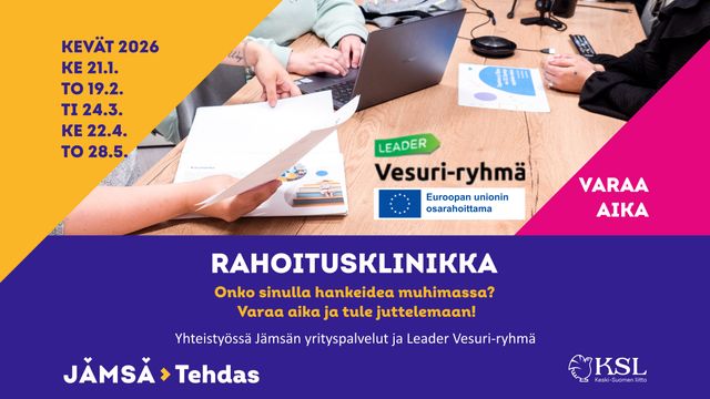 Onko sinulla hankeidea muhimassa, haluatko tavata meneillään olevan hankkeesi tiimoilta tai tarvitseeko yrityksesi tukea? Varaa aika ja tule juttelemaan!Rahoitusklinikalla tapaat Leader Vesuri-ryhmän ja Jämsän kaupungin...