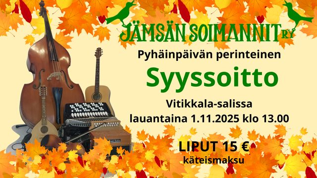 Jämsän Soimannit ry:n perinteinen Syyssoitto soitellaan Vitikkala-salissa, Joonaantie 1, pyhäinpäivänä la 1.11.2025 klo 13.00.Esiintyjinä konsertissa ovat Soimannien Harmonikat laulusolistina Marjatta Kallioinen, mestaripelimannit...