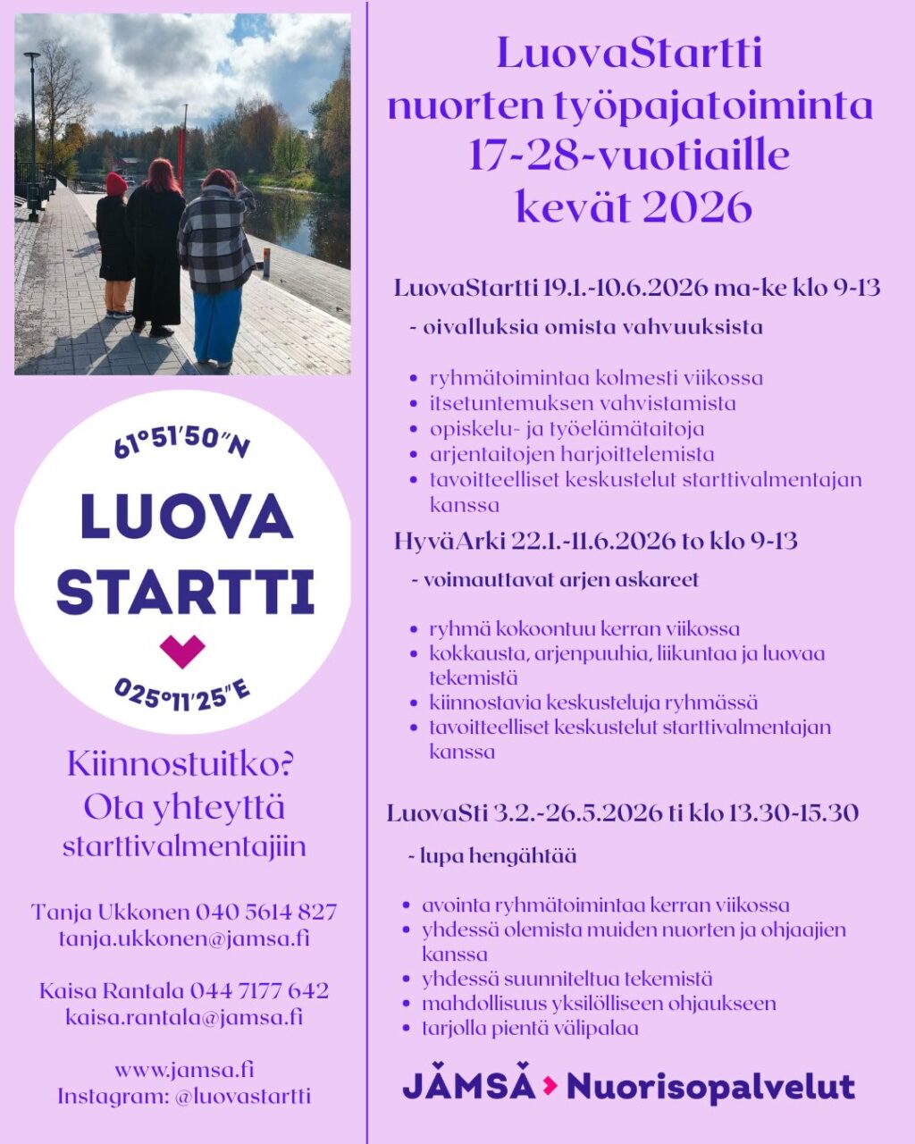 LuovaStartti toimii Nuorten Raitilla, Keskuskatu 2-4, 42199 Jämsä. Nuorisotilaan käynti Forumin takapihan kautta.